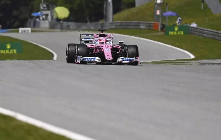 Racing Point driver Sergio Perez of Mexico steers his car during the first practice session for the Styrian Formula One Grand Prix at the Red Bull Ring racetrack in Spielberg, Austria, Friday, July 10, 2020. The Styrian F1 Grand Prix will be held on Sunday. (Joe KlamarPool via AP)