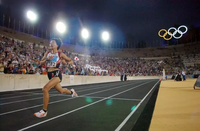 FILE - In this Aug. 22, 2004, file photo, Japan's Mizuki Noguchi takes the final lap inside the Panathinaiko Stadium as she wins the gold medal in the women's marathon in the 2004 Olympic Games in Athens. (AP PhotoRichard Drew, File)