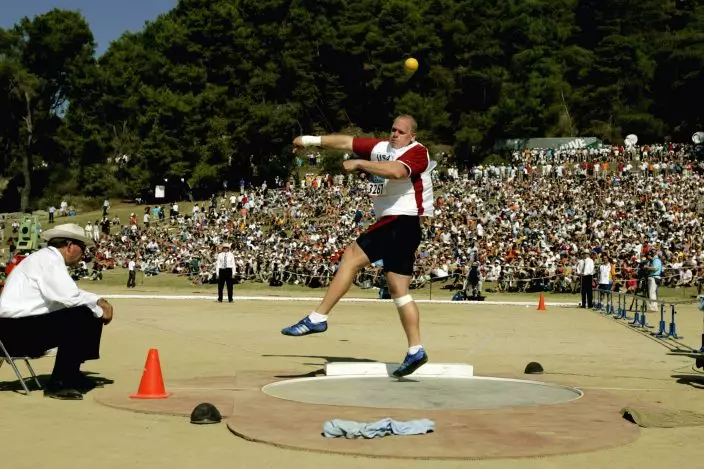 FILE - In this Aug. 18, 2004, file photo, John Godina, of the United States, makes a qualifying throw during the Athens 2004 Olympics men's shot put qualification round in Olympia, Greece. The men's and women's shot put was held in the ancient stadium where the original games were played. (AP PhotoJulie Jacobson, File)