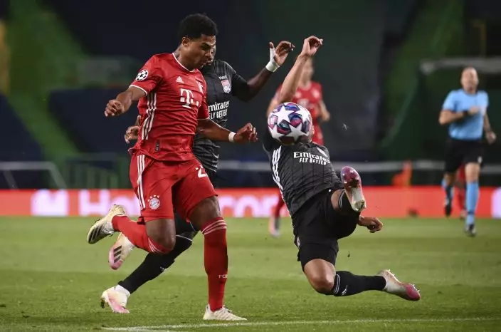 Lyon's Marcal, right, duels for the ball with Bayern's Serge Gnabry during the Champions League semifinal soccer match between Lyon and Bayern at the Jose Alvalade stadium in Lisbon, Portugal, Wednesday, Aug. 19, 2020. (Franck FifePool via AP)