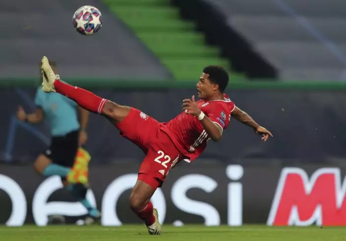FILE - In this Wednesday, Aug. 19, 2020 file photo, Bayern's Serge Gnabry tries to control the ball during their Champions League semifinal soccer match against Lyon at the Jose Alvalade stadium in Lisbon, Portugal. New lightweight soccer boots, or cleats, featuring carbon-fiber plates have been giving players a speedy edge at the Champions League finals. Serge Gnabry has three goals in two games for Bayern Munich, and rival winger Angel Di Maria scored one and set up Paris Saint-Germain’s other two goals in the semifinals. The pandemic-enforced extension to the European season meant the new boots were ready for Gnabry and Di Maria and other Adidas-backed players to wear at the Champions League mini-tournament which ends Sunday, Aug, 23 with Bayern playing PSG in the final. (Miguel A. LopesPool via AP, file)