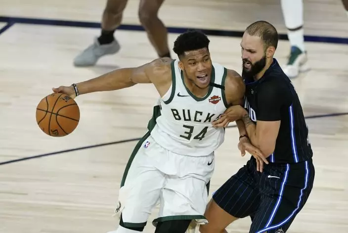 Milwaukee Bucks' Giannis Antetokounmpo (34) drives past Orlando Magic's Evan Fournier (10) during the second half of an NBA basketball first round playoff game Monday, Aug. 24, 2020, in Lake Buena Vista, Fla. (AP PhotoAshley Landis, Pool)