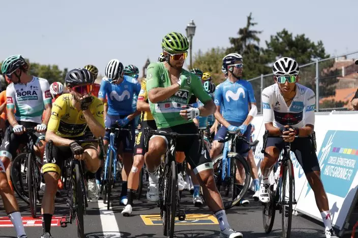 Bitain's Adam Yates, wearing the overall leader's yellow jersey, Slovakia's Peter Sagan, wearing the best sprinter's green jersey and Colombia's Egan Bernal, wearing the best young rider's white jersey at the start of the stage 8 of the Tour de France cycling race over 141 kilometers (87.6 miles) from Cazeres-sur-Garonne to Loudenvielle, France, Saturday, Sept. 5, 2020. (AP PhotoThibault Camus)