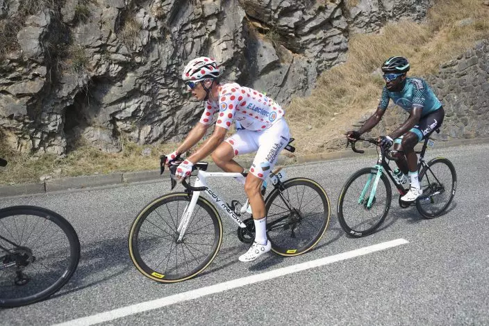 Yellow jersey holder Adam Yates and other Tour contenders, including defending champion Egan Bernal and favorite Primoz Roglic, rode some seven minutes further back.