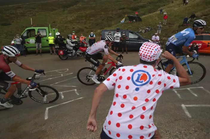 A spectator cheers Spain's Carlos Verona, right, and Denmark's Soren Kragh Andersen as they climb Port de Bales pass during the stage 8 of the Tour de France cycling race over 141 kilometers (87.6 miles) from Cazeres-sur-Garonne to Loudenvielle, France, Saturday, Sept. 5, 2020. (AP PhotoThibault Camus)