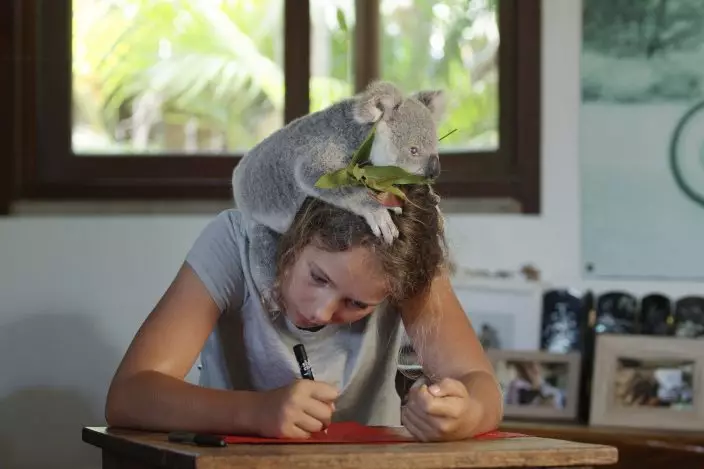 Izzy checks on the koalas every day, feeds them and plays with them. She plays with them in her bed, hugs them while brushing her teeth and helps them climb. Her dad calls her “the koala whisperer.”