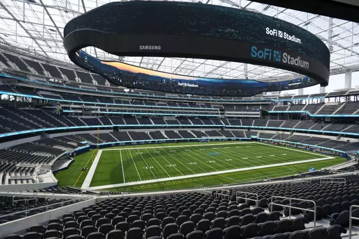 The playing field at SoFi Stadium, the future home for the Los Angeles Rams and the Los Angeles Chargers NFL football teams, is shown Friday, Sept. 4, 2020, in Inglewood, Calif. Stan Kroenke got permission to bring pro football back to Los Angeles because the Rams owner vowed to build an NFL palace and a West Coast hub for the league. Lavish, ultramodern SoFi Stadium certainly appears to live up to those promises as it opens its doors this week, even if fans can't enjoy it right away. (AP PhotoMarcio Jose Sanchez)