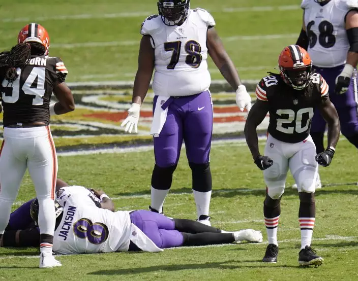 Cleveland Browns cornerback Tavierre Thomas (20) reacts after sacking Baltimore Ravens quarterback Lamar Jackson (8), during the second half of an NFL football game, Sunday, Sept. 13, 2020, in Baltimore, MD. (AP PhotoJulio Cortez)