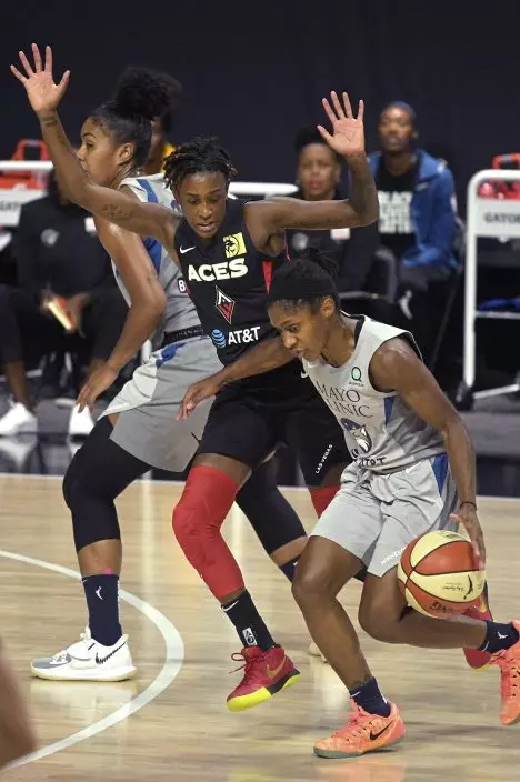 Minnesota Lynx guard Crystal Dangerfield, right, is fouled by Las Vegas Aces guard Danielle Robinson while driving to the basket during the first half of a WNBA basketball game Thursday, Sept. 10, 2020, in Bradenton, Fla. (AP PhotoPhelan M. Ebenhack)