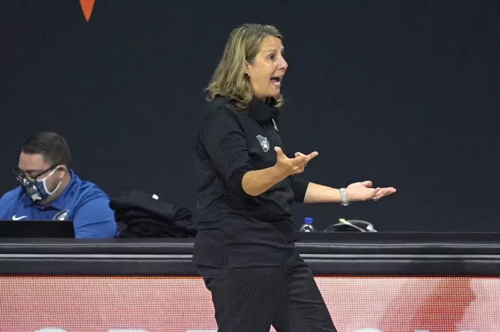 Minnesota Lynx head coach Cheryl Reeve reacts to a play during the first half of a WNBA basketball game against the Las Vegas Aces, Thursday, Sept. 10, 2020, in Bradenton, Fla. (AP PhotoPhelan M. Ebenhack)