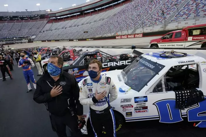 Tate Fogleman, front right, puts his hand over his heart during the national anthem before the NASCAR Truck Series auto race Thursday, Sept. 17, 2020, in Bristol, Tenn. (AP PhotoSteve Helber)