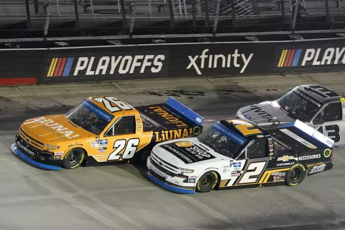 Tyler Ankrum (26) and Sheldon Creed (2) drive into Turn Four during a NASCAR Truck Series auto race Thursday Sept. 17, 2020, in Bristol, Tenn. (AP PhotoSteve Helber)