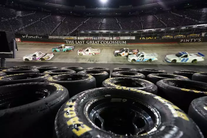 The field passes through Turn 2 during the NASCAR Truck Series auto race Thursday, Sept. 17, 2020, in Bristol, Tenn. (AP PhotoSteve Helber)