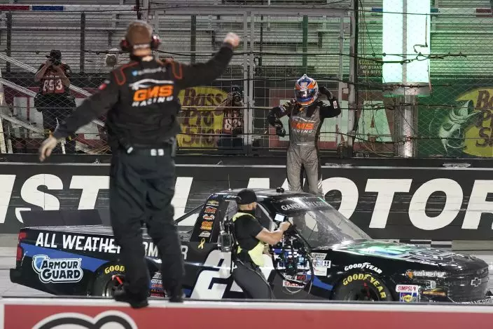 Sam Mayer, right, celebrates his win in the NASCAR Truck Series auto race Thursday, Sept. 17, 2020, in Bristol, Tenn. (AP PhotoSteve Helber)
