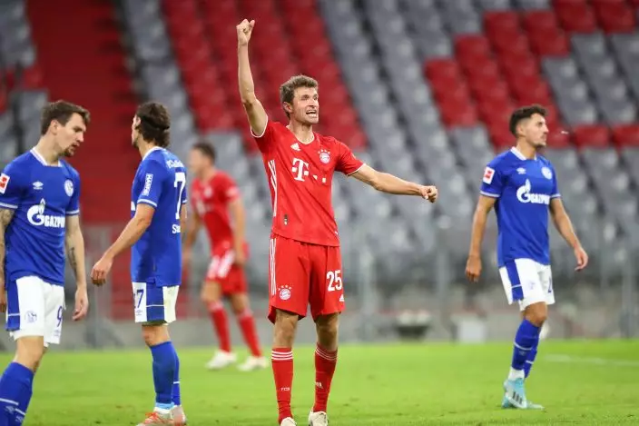 Bayern's Thomas Mueller celebrates after scoring his team's sixth goal, during the German Bundesliga soccer match between FC Bayern Munich and Schalke 04 in Munich, Germany, Friday, Sept. 18, 2020. (AP PhotoMatthias Schrader)