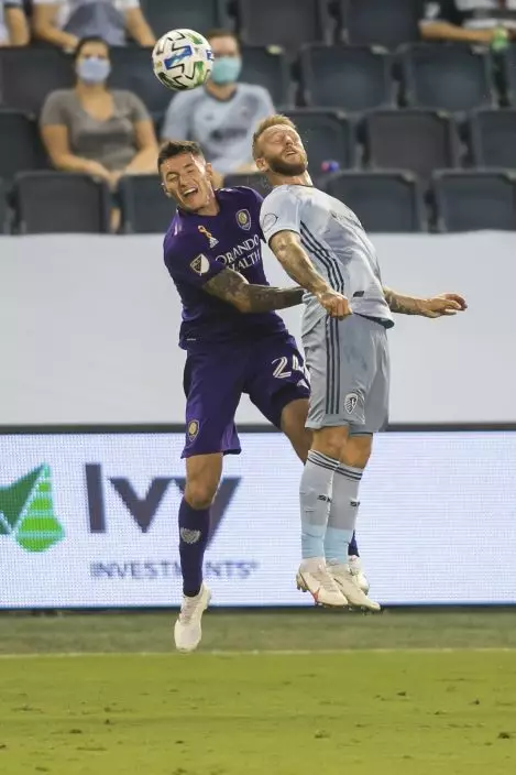 Sporting Kansas City forward Johnny Russell (7) heads the ball away from Orlando City defender Kyle Smith (24) during an MLS soccer game, Wednesday, Sept. 23, 2020 at Children's Mercy Park in Kansas City, Kan. (Nick Tre. SmithThe Kansas City Star via AP)