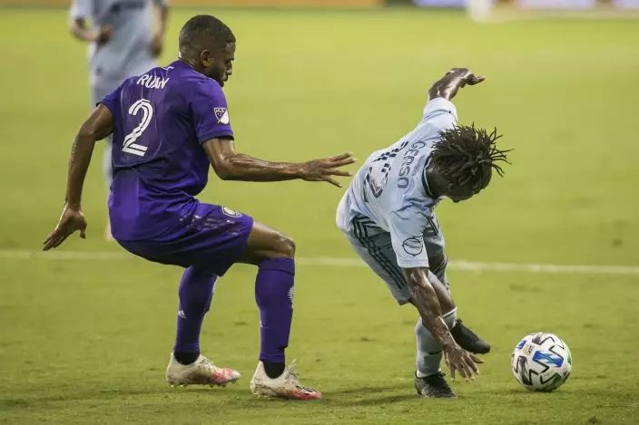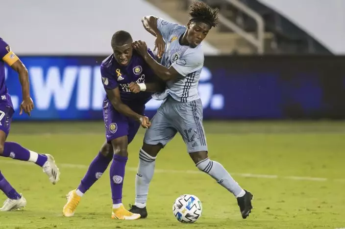 Sporting Kansas City forward Johnny Russell, right, attempts to control the ball against Orlando City midfielder Sebas Mendez (8) during an MLS soccer game, Wednesday, Sept. 23, 2020 at Children's Mercy Park in Kansas City, Kan. (Nick Tre. SmithThe Kansas City Star via AP)