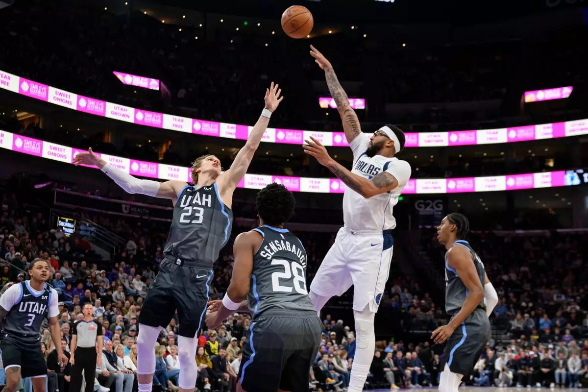 Dallas Mavericks forward Anthony Davis, center right, shoots over Utah Jazz forward Lauri Markkanen (23) during the first half of an NBA basketball game, Thursday, Jan. 8, 2026, in Salt Lake City. (AP Photo/Tyler Tate)