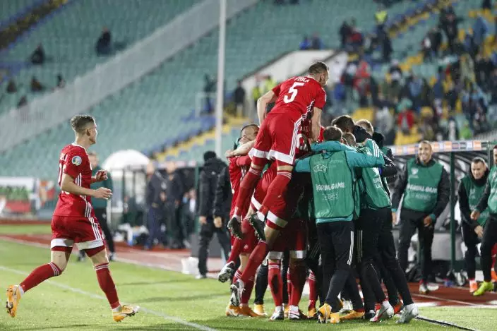 Hungary's players celebrate their side's second goal scored by Hungary's Zsolt Kalmar during the Euro 2020 playoff semifinal soccer match between Bulgaria and Hungary at the Vasil Levski stadium in Sofia, Bulgaria, on Thursday Oct. 8, 2020. (AP PhotoAnton Uzunov)