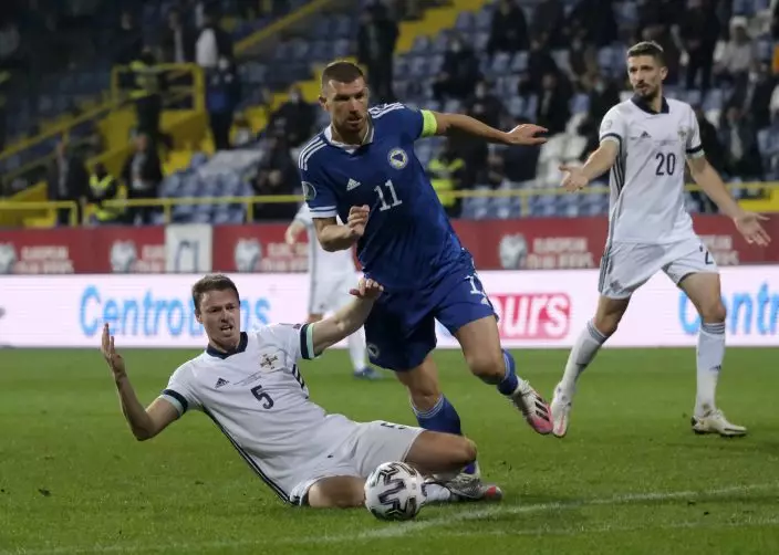 Northern Ireland's Jonny Evans, left, duels for the ball with Bosnia's Edin Dzeko during the Euro 2020 playoff semifinals soccer match between Bosnia-Herzegovina and Northern Ireland at the Grbavica stadium, in Sarajevo, Bosnia, Thursday, Oct. 8, 2020. (AP PhotoKemal Softic)