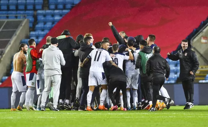 Serbia's national football team cheers after victory during the Euro 2020 playoff semifinal soccer match between Norway and Serbia at Ullevaal Stadium, in Oslo, Norway, Thursday, Oct. 8, 2020. (Fredrik VarfjellNTB scanpix via AP)