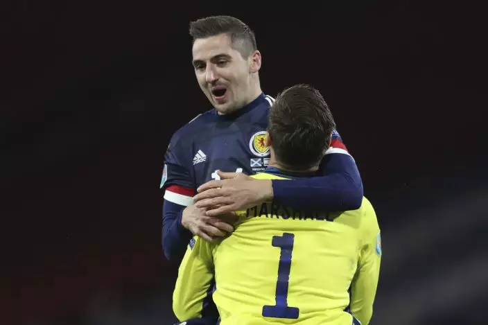 Scotland's Kenny McLean, right, celebrates with Scotland goalkeeper David Marshall after scoring from a penalty shot during the Euro 2020 playoff semifinal soccer match between Scotland and Israel, at the Hampden stadium in Glasgow, Scotland, Thursday, Oct. 8, 2020. (AP PhotoScott Heppell)