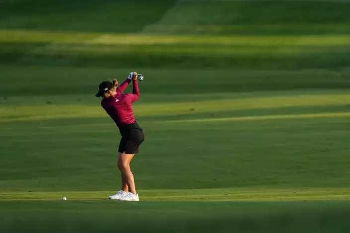 Linnea Strom, of Sweden, hits from the fairway on the 16th hole during the second round of the KPMG Women's PGA Championship golf tournament at the Aronimink Golf Club, Friday, Oct. 9, 2020, in Newtown Square, Pa. (AP PhotoMatt Slocum)