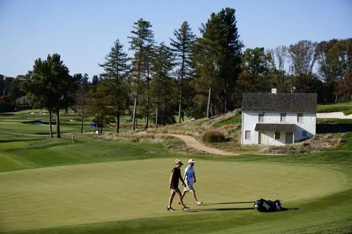 Anna Nordqvist, of Sweden, walks off the 11th green during the second round of the KPMG Women's PGA Championship golf tournament at the Aronimink Golf Club, Friday, Oct. 9, 2020, in Newtown Square, Pa. (AP PhotoMatt Slocum)