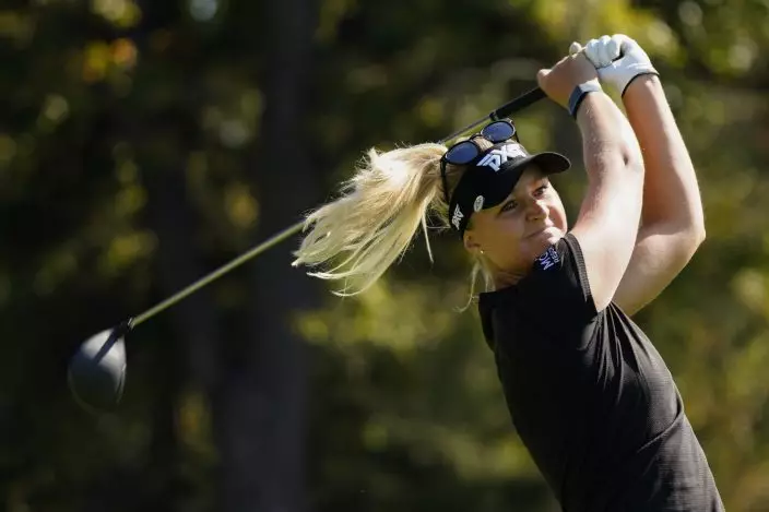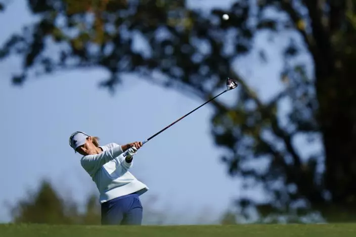 Anna Nordqvist, of Sweden, watches her tee shot on the second hole during the second round of the KPMG Women's PGA Championship golf tournament at the Aronimink Golf Club, Friday, Oct. 9, 2020, in Newtown Square, Pa. (AP PhotoChris Szagola)