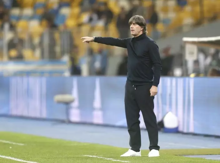 Germany's Joachim Low stands on the touchline during the UEFA Nations League soccer match between Ukraine and Germany at the Olimpiyskiy Stadium in Kyiv, Ukraine, Saturday, Oct.10, 2020. (AP PhotoEfrem Lukatsky)