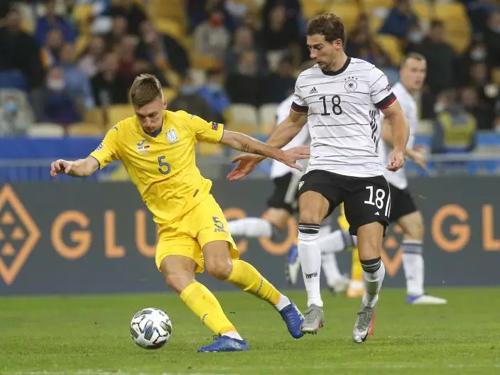 Ukraine's Serhiy Sydorchuk, left, and Germany's Leon Goretzka challenge for the ball during the UEFA Nations League soccer match between Ukraine and Germany at the Olimpiyskiy Stadium in Kyiv, Ukraine, Saturday, Oct.10, 2020. (AP PhotoEfrem Lukatsky)