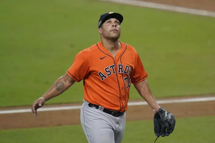 Houston Astros pitcher Andre Scrubb walks off after being relieved during the seventh inning in Game 6 of a baseball American League Championship Series against the Tampa Bay Rays, Friday, Oct. 16, 2020, in San Diego. (AP PhotoGregory Bull)