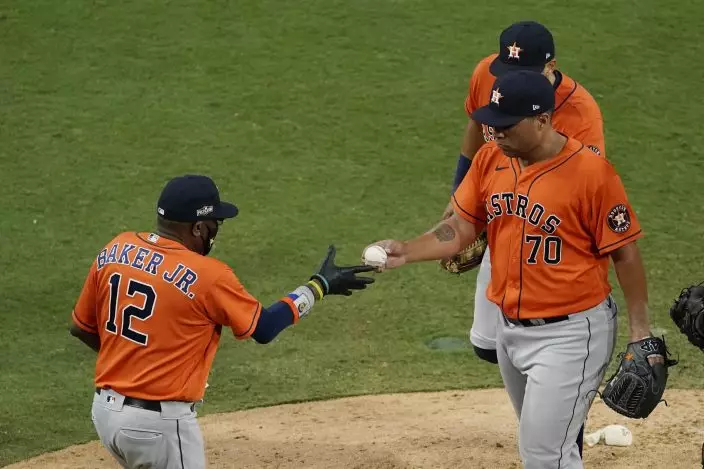 Houston Astros pitcher Andre Scrubb (70) is relieved by Houston Astros manager Dusty Baker Jr. during the seventh inning in Game 6 of a baseball American League Championship Series, Friday, Oct. 16, 2020, in San Diego. (AP PhotoAshley Landis)