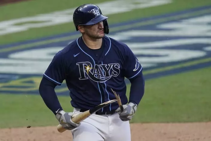 Tampa Bay Rays' Mike Zunino breaks his bat after striking against the Houston Astros during the fifth inning in Game 6 of a baseball American League Championship Series, Friday, Oct. 16, 2020, in San Diego. (AP PhotoAshley Landis)