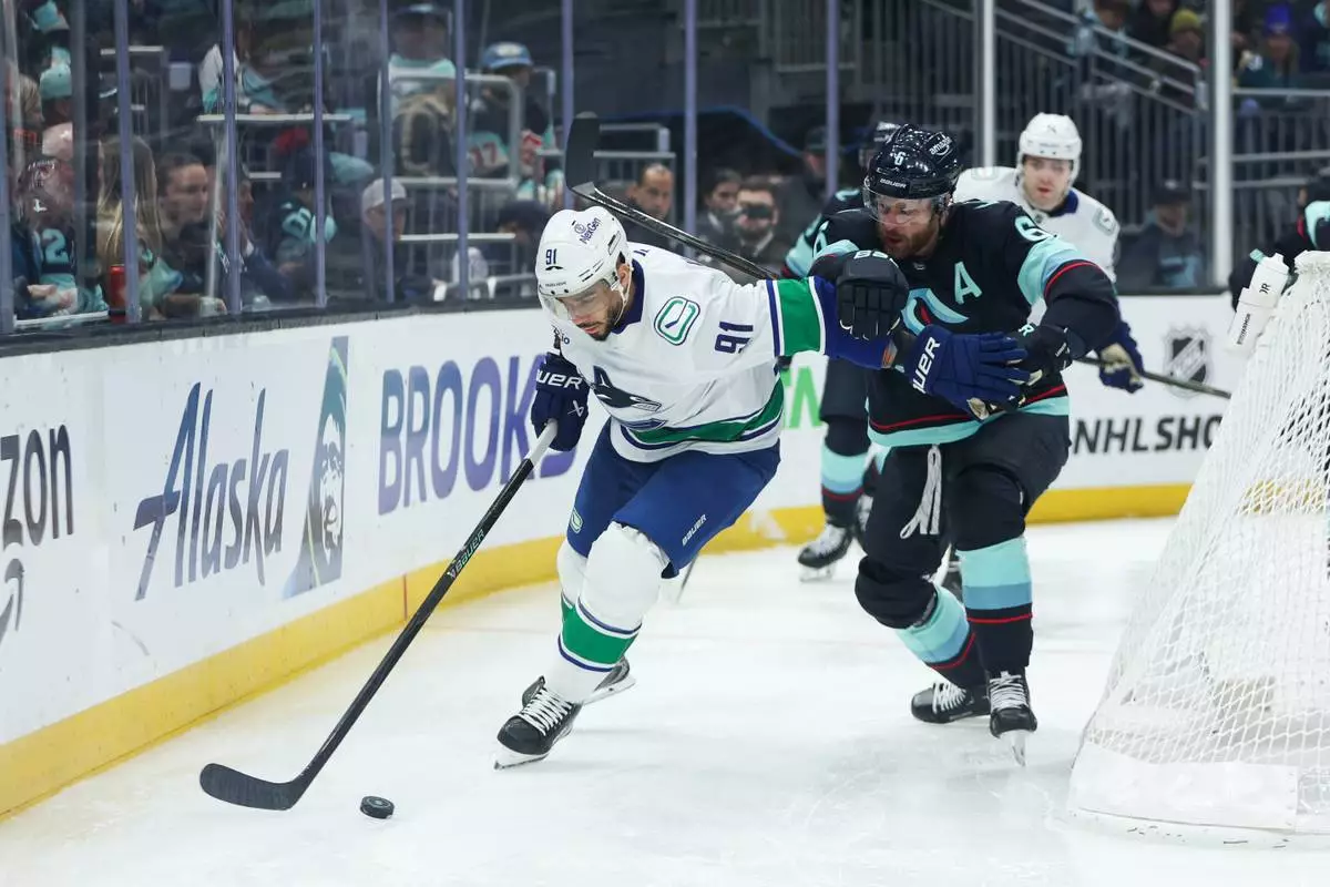 Vancouver Canucks left wing Evander Kane (91) moves the puck while defended by Seattle Kraken defenseman Adam Larsson (6) in the second period during an NHL hockey game Saturday, Feb. 28, 2026, in Seattle. (AP Photo/Kevin Ng)