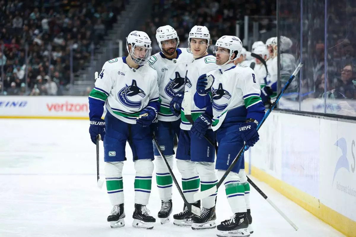 Vancouver Canucks defenseman Zeev Buium (24), defenseman Pierre-Olivier Joseph (7), left wing Liam Ohgren (92) and right wing Conor Garland (8), left to right, celebrate a goal scored by left wing Liam Ohgren (92) in the second period against the Seattle Kraken during an NHL hockey game Saturday, Feb. 28, 2026, in Seattle. (AP Photo/Kevin Ng)