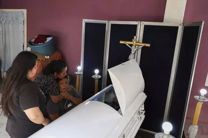 FILE - In this July 2, 2020 file photo, Martha Alvarado, sitting, is comforted in her home during the wake for her son Jorge Bravo who was killed along with at least 26 others in an attack at a drug rehabilitation center where he was being treated in Irapuato, Mexico. The two most powerful drug cartels in the hemisphere are battling over this industrial and farming hub of central Mexico — a state that has attracted gangs for the same reason it has lured auto manufacturers: road and rail networks that lead straight to the U.S. border. (AP PhotoEduardo Verdugo, File)
