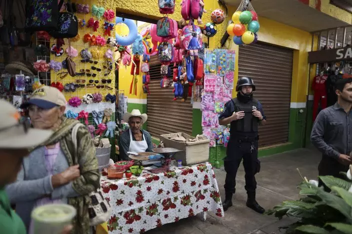 FILE - In this Feb. 10, 2020 file photo, a policeman stands guard as the city mayor attends an event to inaugurate renovated sections of the market, which, along with other local businesses, has suffered as violence has kept regional shoppers away in Apaseo El Alto, Guanajuato state, Mexico. The two most powerful drug cartels in the hemisphere are battling over this industrial and farming hub of central Mexico — a state that has attracted gangs for the same reason it has lured auto manufacturers: road and rail networks that lead straight to the U.S. border. (AP PhotoRebecca Blackwell, File)