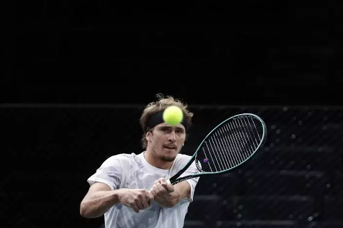 Germany's Alexander Zverev, returns to Serbia's Miomir Kecmanovic, during their match of the Paris Masters tennis tournament at the Bercy Arena in Paris, Wednesday, Nov. 4, 2020. (AP PhotoThibault Camus)