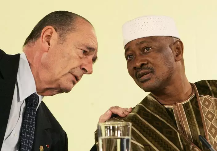 FILE - In this Sunday, Dec. 4, 2005 file photo, French President Jacques Chirac, left, and Mali's President Amadou Toumani Toure, right, talk prior to their joint press conference during the 23rd Africa-France summit in Bamako, Mali. Mali's former president Amadou Toumani Toure, who served as Mali's president from 2002 until March 2012 when he was deposed by a military coup, has died at the age of 72, according to Senegal's President Macky Sall on Tuesday, Nov. 10, 2020. (AP PhotoMichel Euler, File)