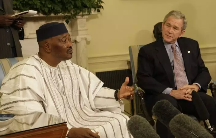 FILE - In this Tuesday, Feb. 12, 2008 file photo, President Bush, right, meets with Mali's President Amadou Toumani Toure in the Oval Office of the White House in Washington. Mali's former president Amadou Toumani Toure, who served as Mali's president from 2002 until March 2012 when he was deposed by a military coup, has died at the age of 72, according to Senegal's President Macky Sall on Tuesday, Nov. 10, 2020. (AP PhotoPablo Martinez Monsivais, File)