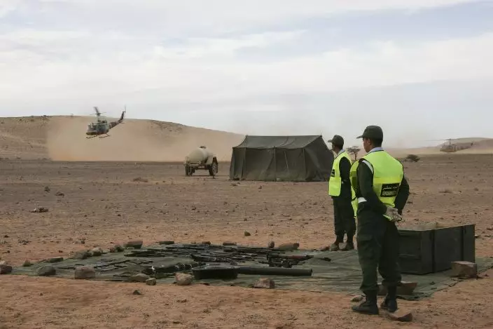 FILE - In this Jan.5, 2011 file photo, weapons discovered by Morocco's police in Western Sahara are placed in Laayoune. The Moroccan military has intervened in a U.N.-patrolled border zone in the disputed Western Sahara to clear a key road it said was being blockaded for weeks by supporters of the pro-independence Polisario Front. Moroccan forces set up a security cordon overnight in the Guerguerat buffer zone on Western Sahara's southern border with Mauritania, "in order to secure the flow of goods and people through this axis," (AP PhotoAbdeljalil Bounhar, File)