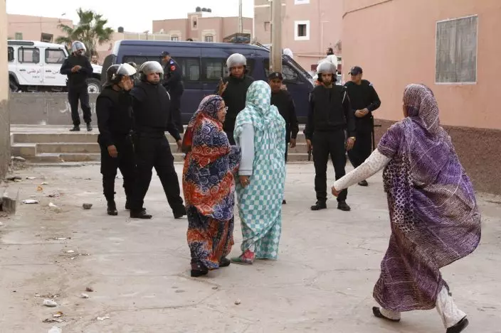 FILE - In this photo taken Tuesday, Dec. 10, 2013, Western Saharan women confront riot police in Laayoune, the capital of the disputed territory of the Western Sahara. The Moroccan military has intervened in a U.N.-patrolled border zone in the disputed Western Sahara to clear a key road it said was being blockaded for weeks by supporters of the pro-independence Polisario Front. Moroccan forces set up a security cordon overnight in the Guerguerat buffer zone on Western Sahara's southern border with Mauritania, "in order to secure the flow of goods and people through this axis," (AP PhotosPaul Schemm, File)