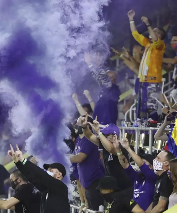Orlando City fans cheer during the team's MLS soccer match against the Columbus Crew in Orlando, Fla., Wednesday, Nov. 4, 2020. Orlando won 2-1. (Stephen M. DowellOrlando Sentinel via AP)