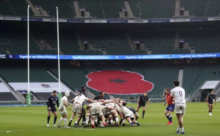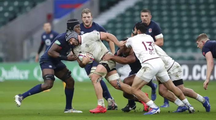 A view of England and Georgia players, during a scrum, during the Autumn Nations Cup rugby uinion match between England and Georgia, at Twickenham, south west London, Saturday, Nov. 14, 2020. (David DaviesPA via AP)