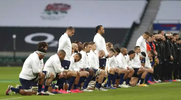 England players line up prior to the Autumn Nations Cup rugby uinion match between England and Georgia, at Twickenham, south west London, Saturday, Nov. 14, 2020. (David DaviesPA via AP)