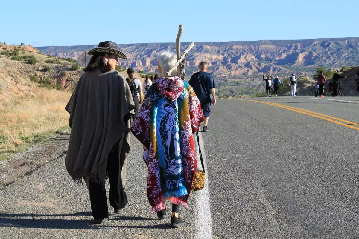 Diane De Leon, left, and her mother, Victoria Trujillo, right, make the Good Friday pilgrimage to El Santuario de Chimayó in Chimayó, New Mexico, on Friday, April 3, 2026. (AP Photo/Susan Montoya Bryan)