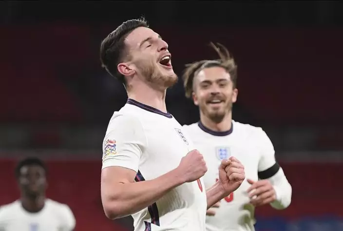 England's Declan Rice celebrates after scoring the opening goal during the UEFA Nations League soccer match between England and Iceland at Wembley stadium in London, Wednesday, Nov. 18, 2020. (Michael ReganPool via AP)