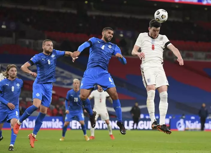 England's Declan Rice, right, heads the ball during the UEFA Nations League soccer match between England and Iceland at Wembley stadium in London, Wednesday, Nov. 18, 2020. (Michael ReganPool via AP)