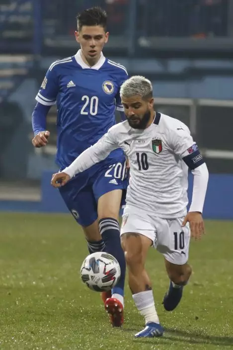 Italy's Lorenzo Insigne, right, is challenged by Bosnia's Dennis Hadzikadunic during the UEFA Nations League soccer match between Bosnia and Italy, in Sarajevo, Bosnia, Wednesday, Nov. 18, 2020. (AP PhotoKemal Softic)